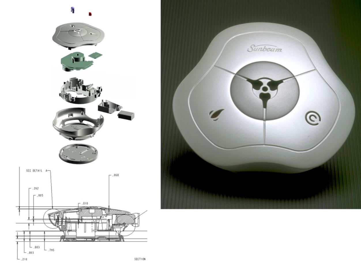 Mechanical design of a product mechanism, award winning product styling, prototyping and tooling geometry.
